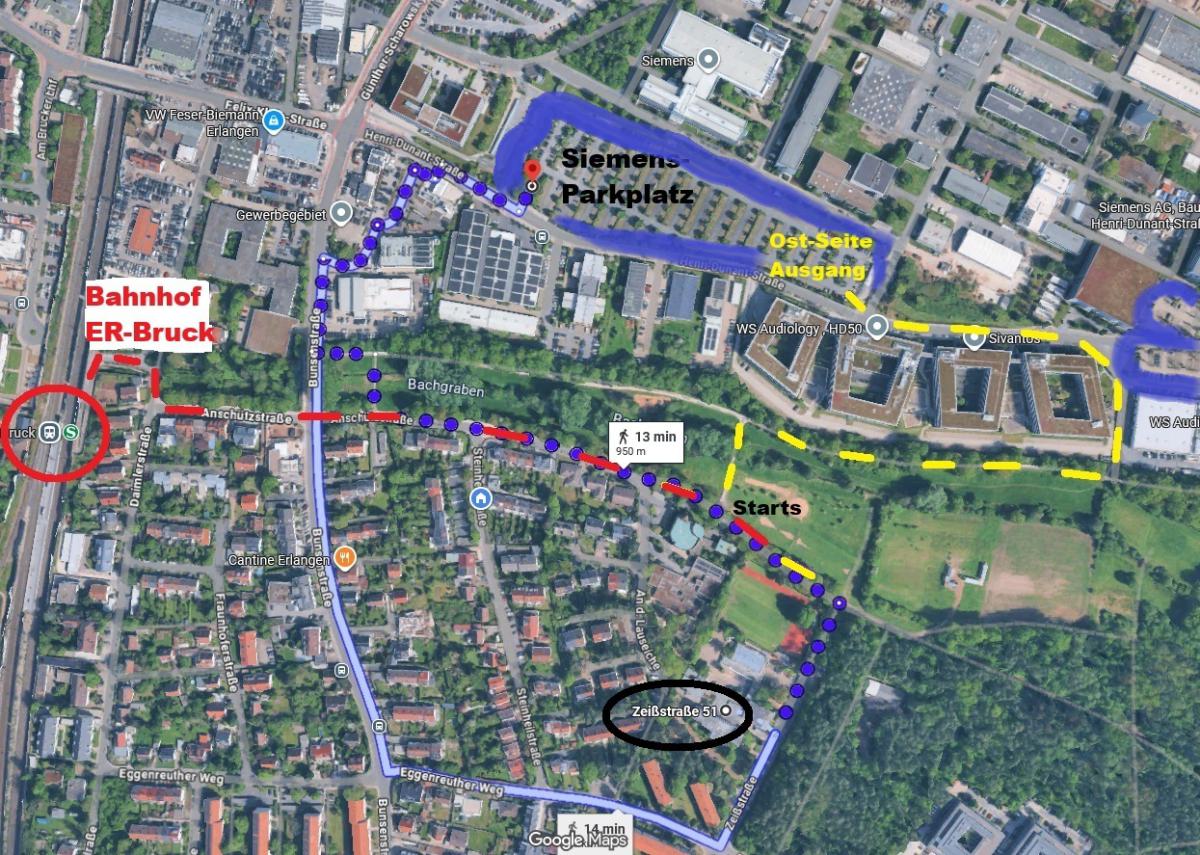 Zufahrt/Parken: So schützt du die Natur: Wir sind gut per Bahn erreichbar, denn Bahnhof Erlangen-Bruck ist nur ca. 800m vom Wettkampfbüro entfernt. Ausgang rechts Daimlerstraße und geradeaus auf der Anschützstraße. Auch mit dem Fahrrad sind die "Erlanger*innen" schnell vor Ort!